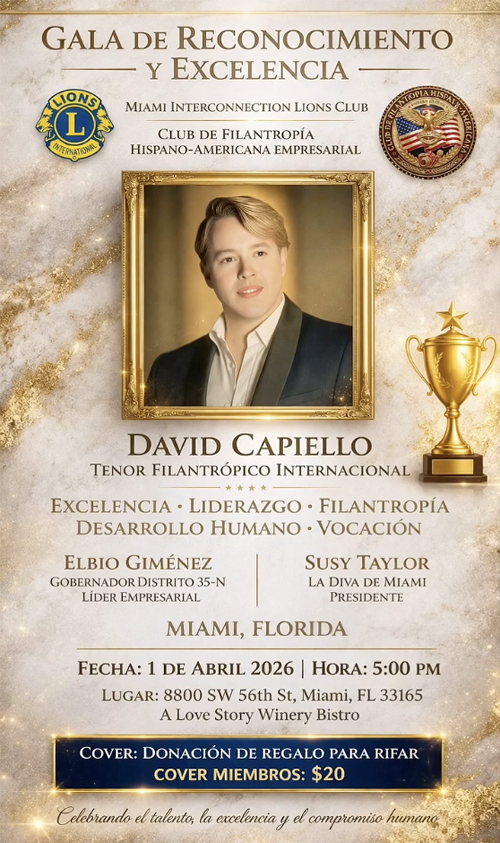 En una velada de alto nivel que celebra el talento, la excelencia y el compromiso social, el reconocido contra tenor y artista venezolano David Capiello será homenajeado en la Gala de Reconocimiento y Excelencia, en el marco del evento “MIAMI INTERCONNECTION LIONS CLUB Y AWARDS DE FILANTROPÍA HISPANO-AMERICANA EMPRESARIAL 2026-2027 – Networking Events”, que se llevará a cabo el miércoles 1 de abril de 2026 a las 5:00 p.m. en A Love Story Winery Bistro (8800 SW 56th St, Miami, FL 33165).